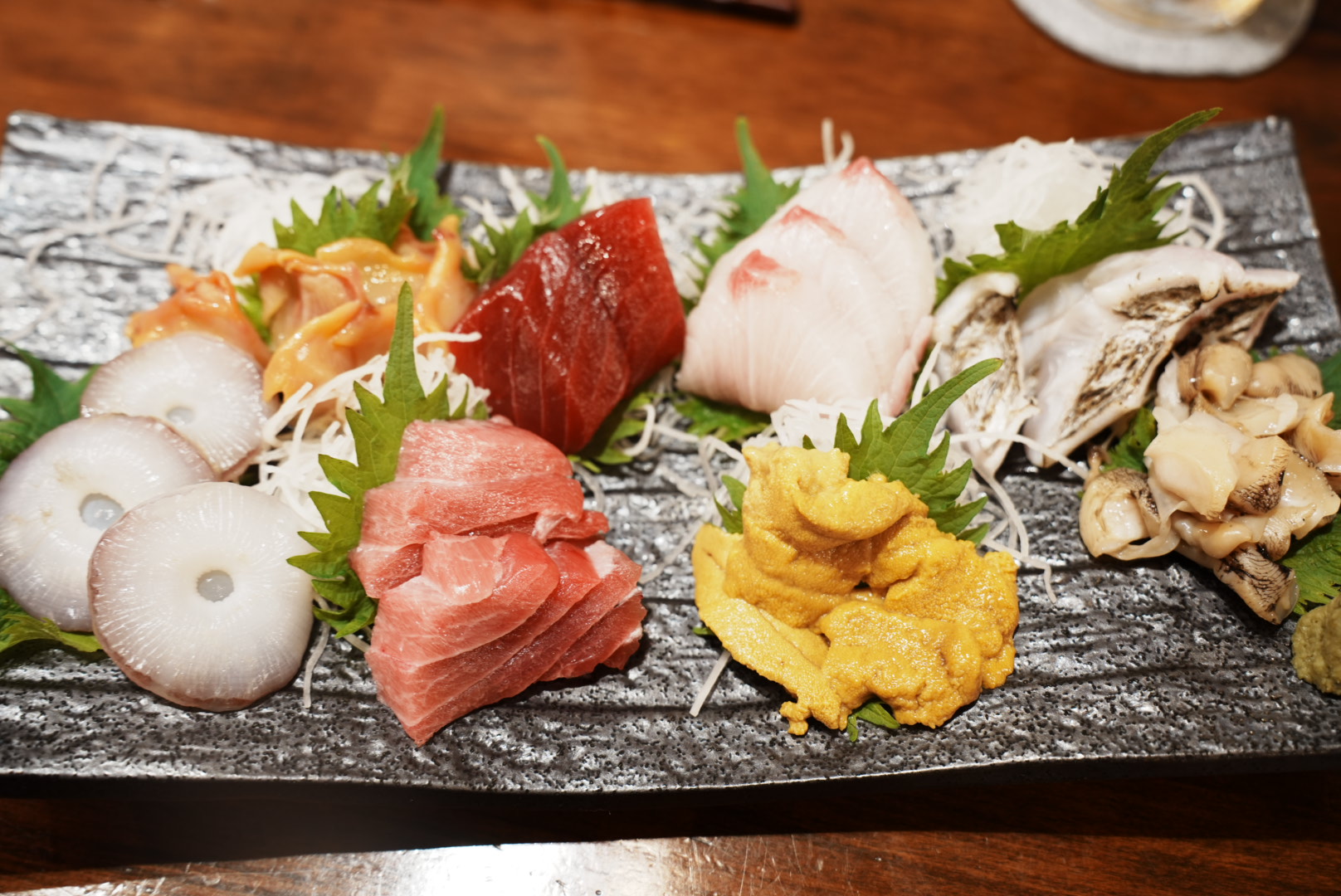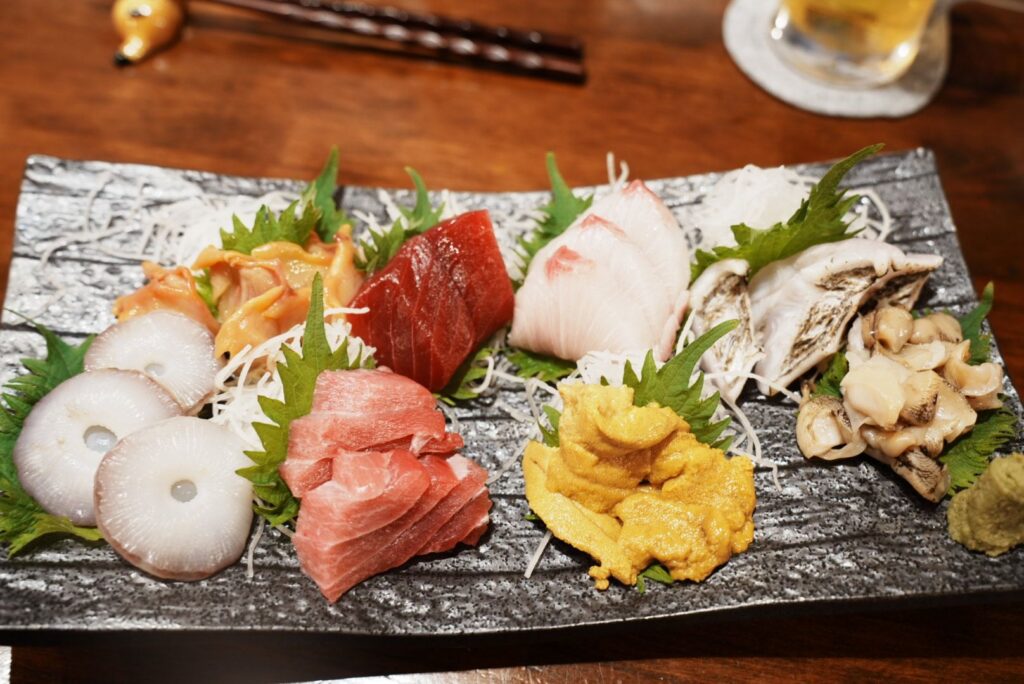 豪華な刺身7点盛り合わせを注文。タコの切り身の厚さ、歯ごたえ、鮮度が良いからかコリコリで最高。