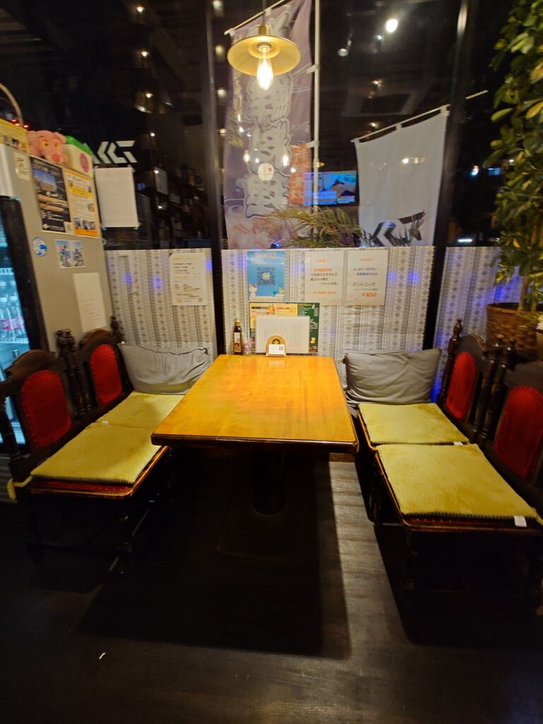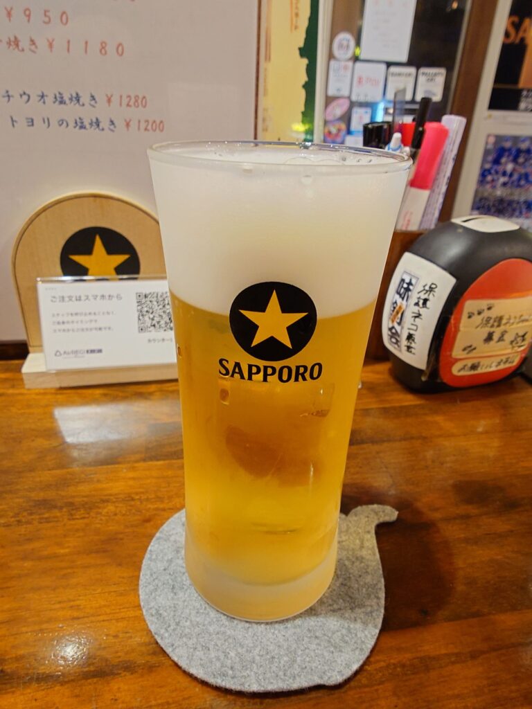 マスターやスタッフさん、お客さんも釣り好きが集まるお店。とりあえずビールとお通しを頂きながら注文。