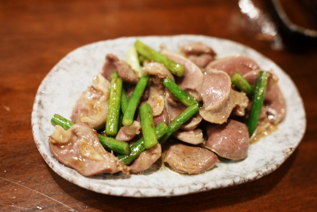 魚がメインのお店だけど、ツマミは色々な種類がそろっていてどれも美味しい。砂肝炒めも歯ごたえよく、酒が進む。